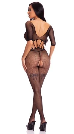 Seduce away in this sexy, large net cut out bodystocking, featuring thin spaghetti straps with a seamless, caged bodice, crotchless bottom, multi-string garter straps, connecting to matching net stockings.