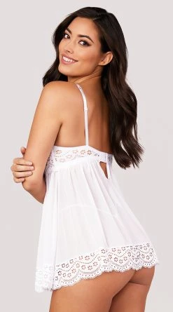 Tempt and tease in this sultry babydoll set featuring sheer mesh cups with a scalloped eyelash lace trim, an allover striped pattern, peekaboo underboob panels, adjustable spaghetti straps with eyelash lace detailing, a satin bow accent, a sheer striped skirt with an eyelash lace trim, open sides, and a matching thong with side tie closures.