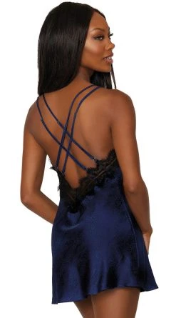 You’ll wake up refreshed and ‘in the mood’ with this gorgeous chemise featuring sheer mesh cups with an eyelash lace trim, a plunging neckline, halter ties, a loose satin bodice with cascading lace sides, a low open back, a sheer back panel, and a matching g-string panty.
